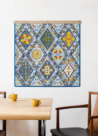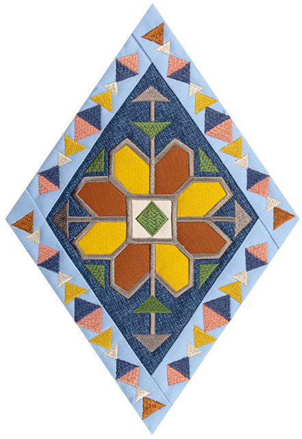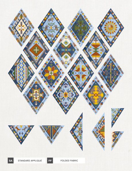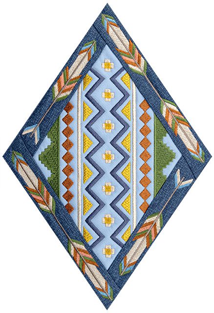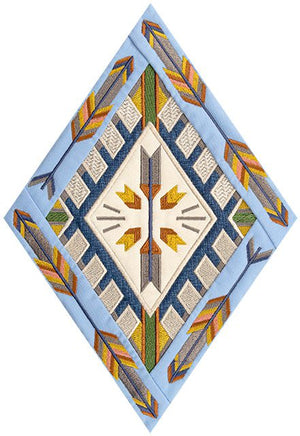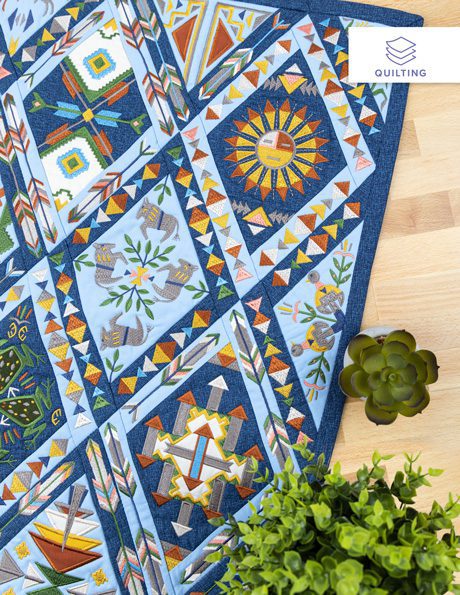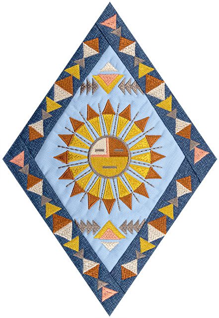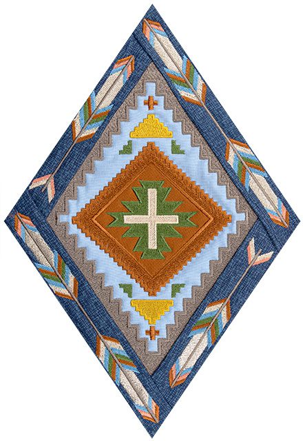 Each of the 14 main quilt blocks and 6 additional triangular blocks feature standard appliqué with folded fabric borders. Geometric embroidered designs like stair-stepped diamonds, arrows, and feathers are featured in the center of every block, accompanied by animal motifs and other Southwestern symbols. Use a variety of richly-colored fabrics in an alternating fashion to help create a extraordinary quilt you’ll be proud to display!