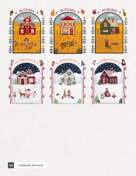 At Anita Goodesign, we love the holidays so much that we consider Christmas to be the unofficial fifth season, so this collection also includes 3 additional designs—just for Christmas! These Seasonal House Trios look great when displayed together in a triptych, and can even be stitched onto pillows or hand towels for an instant decor refresh all year long.