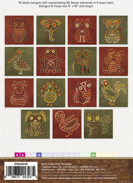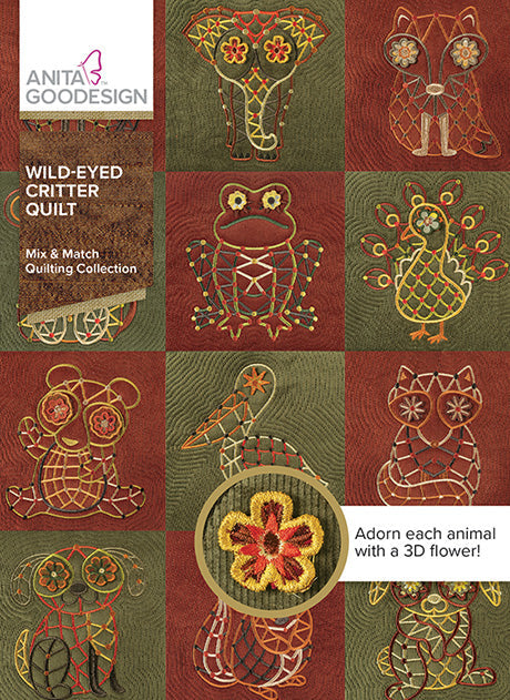 Inspired by ground breaking 70’s style and fashion, each block features rich, deep colours, with a playful macramé-style satin stitched body on top of a corduroy base. The exciting echo-stitch around each quilted animal creates a dynamic look to a still image, giving life and emotion to these adorable blocks. Follow our colour-way to groove back into the 70’s style, or try your own selection of colourful fabrics and threads to carry into the next decade.