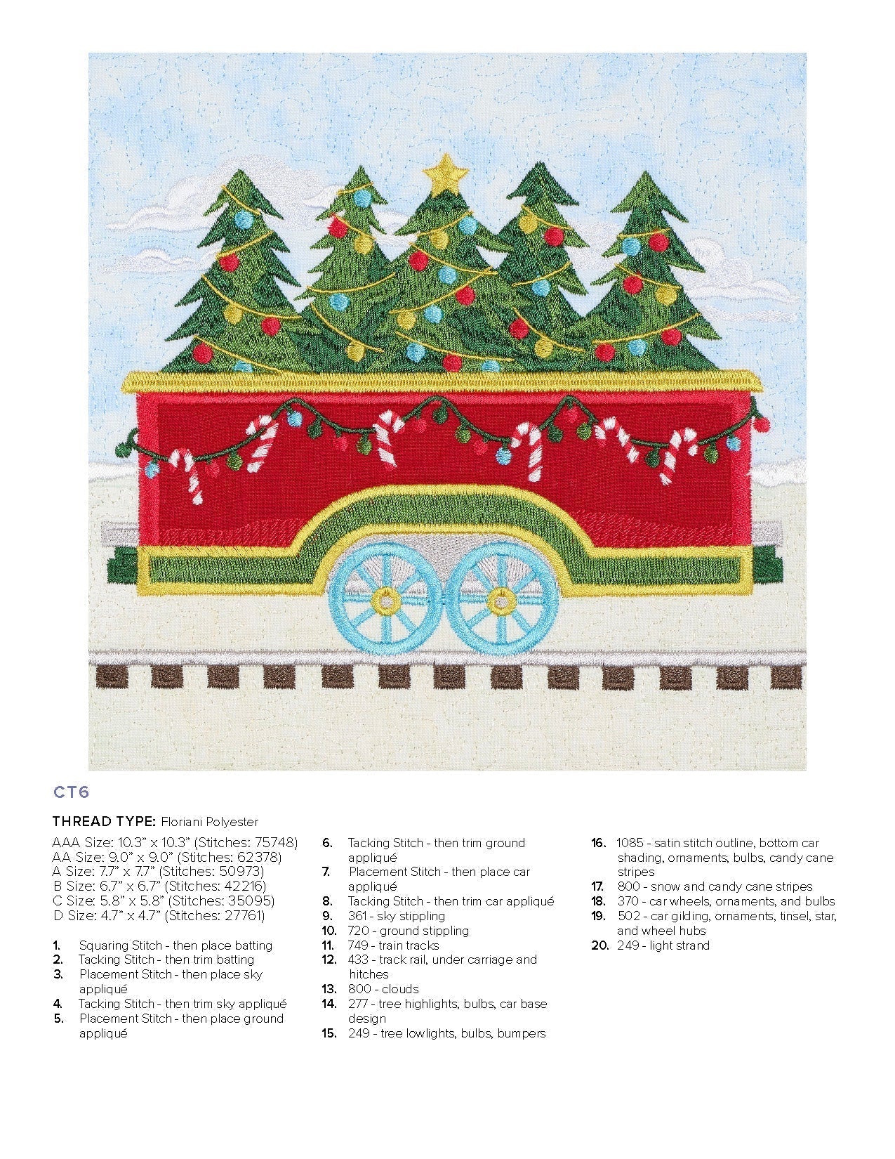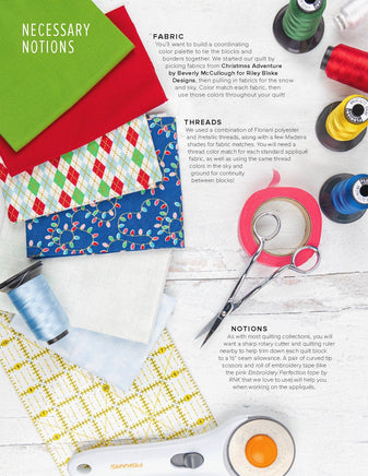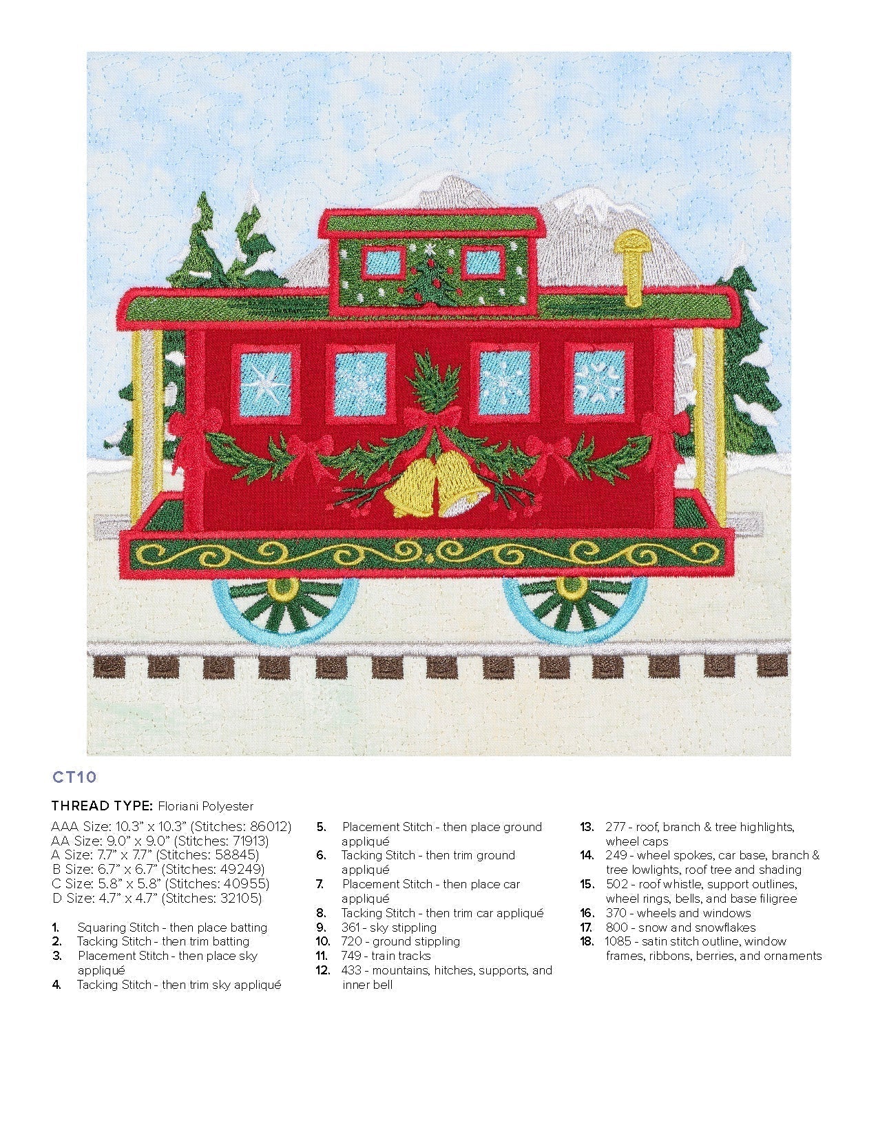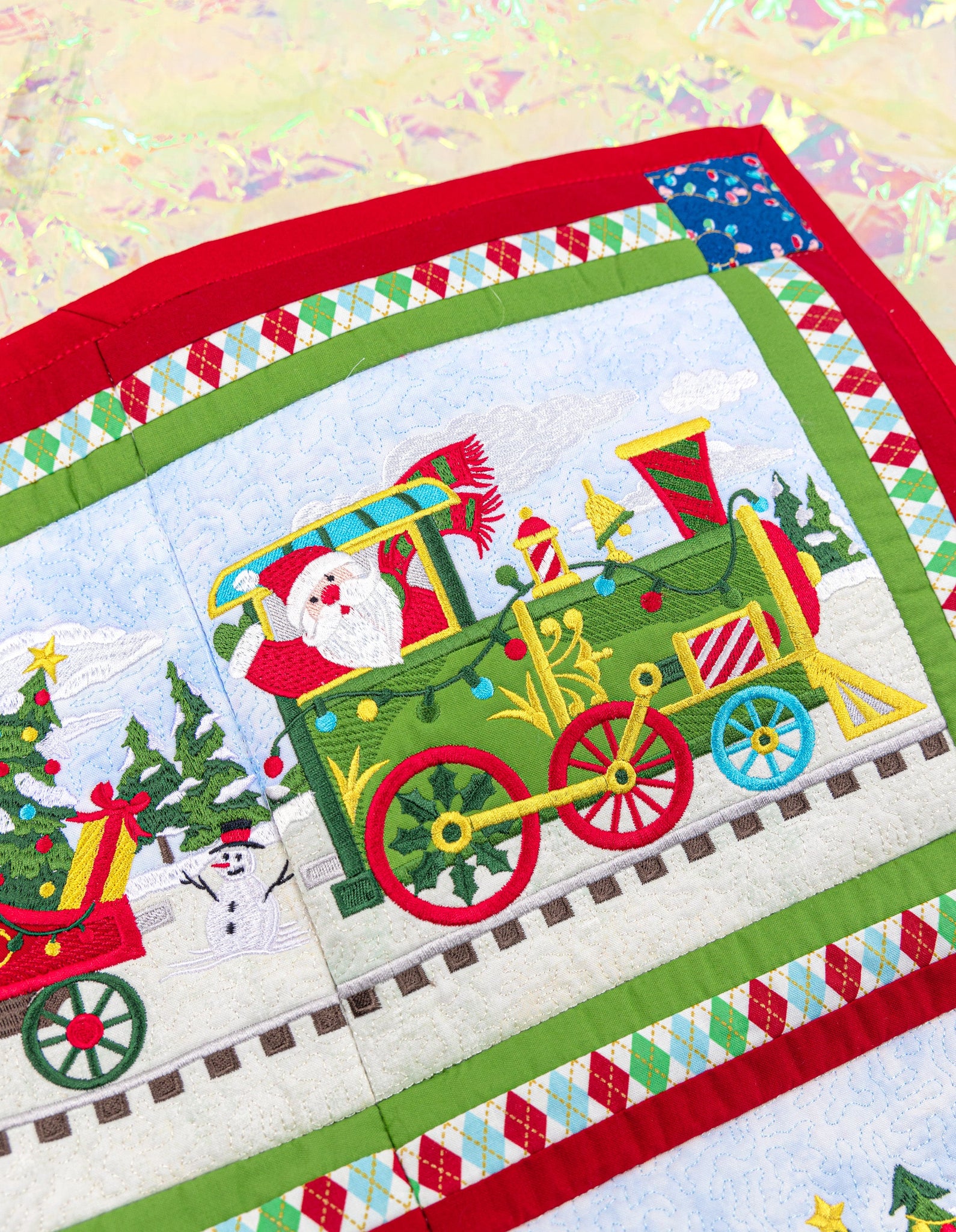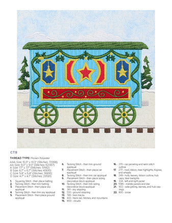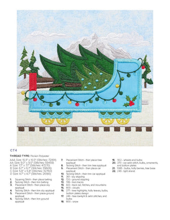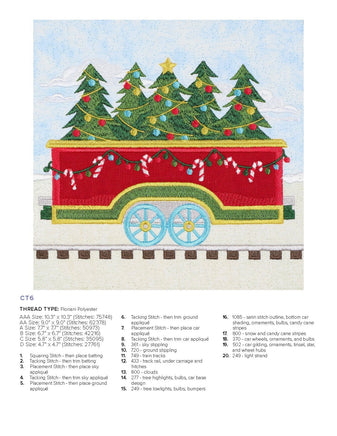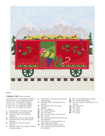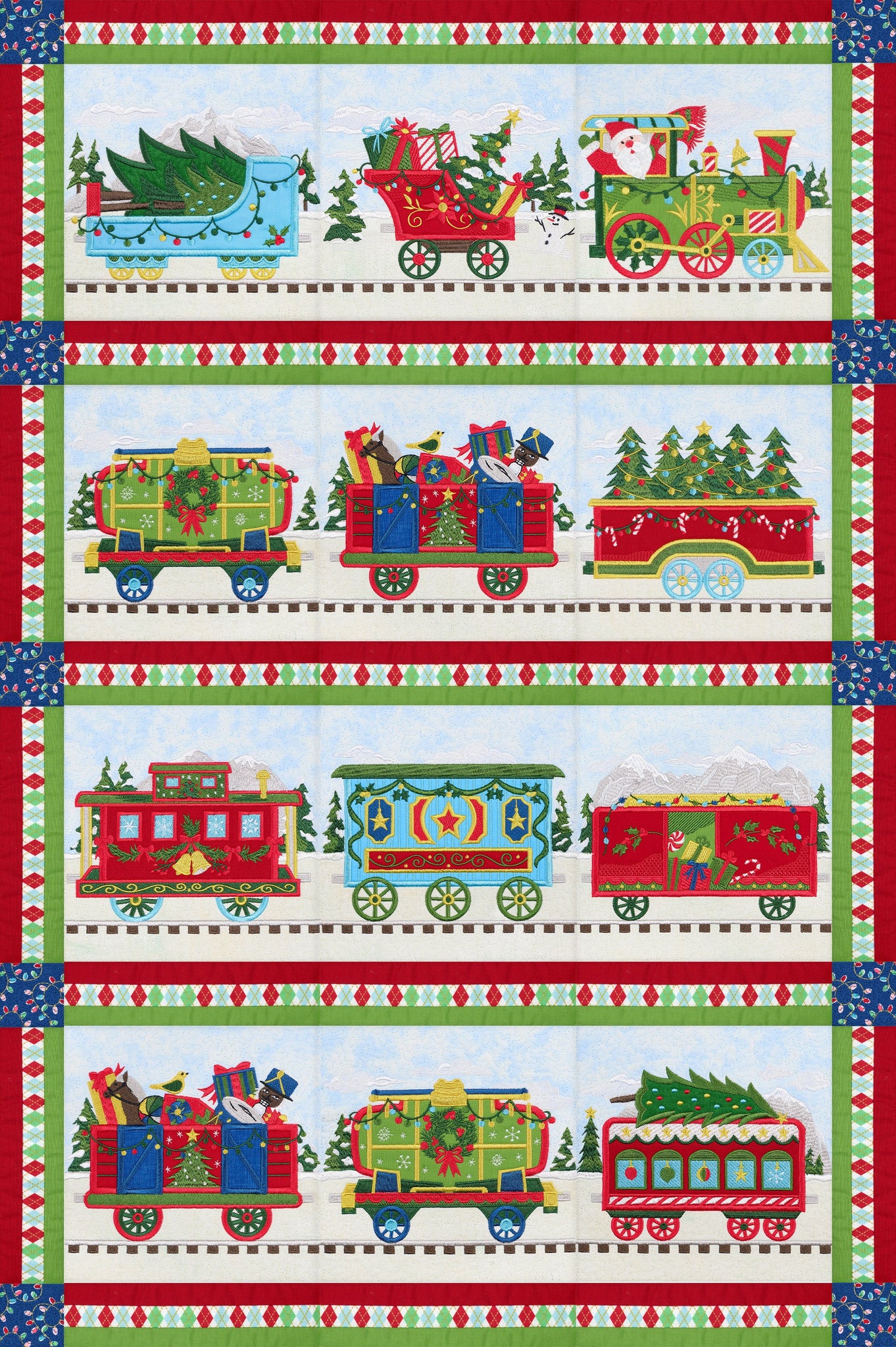 Our charming Christmas Train is ready for departure! Each block in this collection features boxcars constructed in various festive colors, embroidered details, and bold appliqués. The lead train features Santa, but the beauty of this collection is there is no set order in the blocks that have to go in! Create a train carrying all Christmas trees or a whole load of presents! Mix the blocks around for your ideal combination—whether you make the full quilt or a row of 3 blocks as a wall hanging.