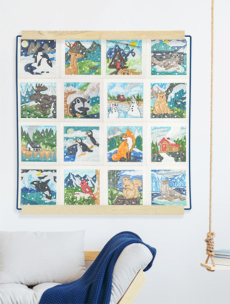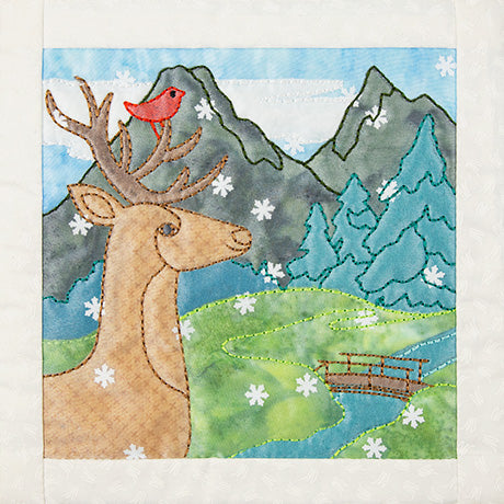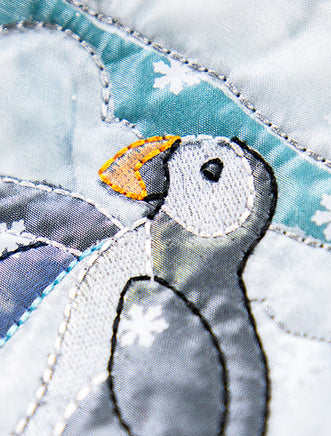 To create the look of falling snow in each of these unique quilt blocks, we used a fun snowflake-shaped paper punch to make dainty pieces of snowflake confetti. Once all the appliqué and embroidery steps beneath the organza are complete, you can sprinkle the little snowflakes across the surface of each quilt block. Use them sparingly for a soft, dreamy flurry, or rain them down for a snowy blizzard! Worried about washing? You can always use other materials for your snowflakes like thin gauge vinyl to ensure they’ll live up to the laundering!