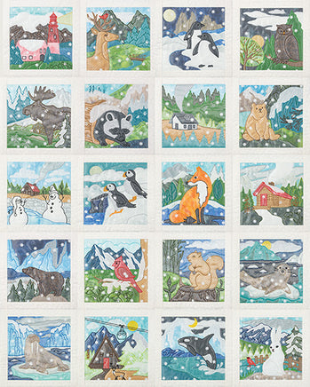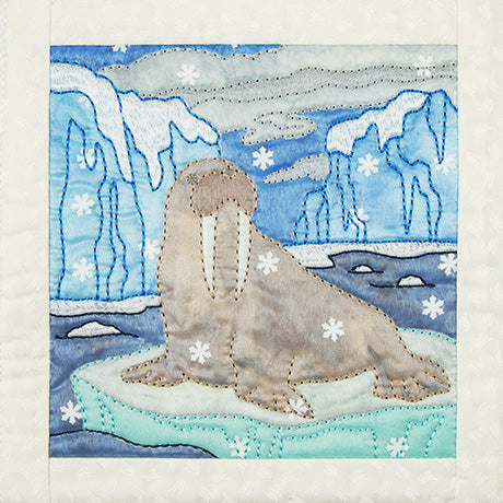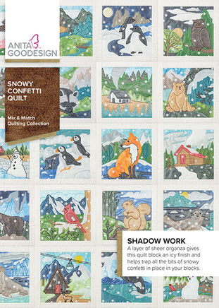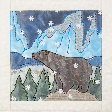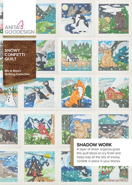 The snowy weather is hardly complete without a cold front! A layer of sheer organza not only gives these quilt block an icy finish, but it also helps trap all the bits of snowy confetti in place in your blocks. The detailed bean stitches on top of the organza highlight the appliqué shapes beneath, creating the perfect winter wonderland.