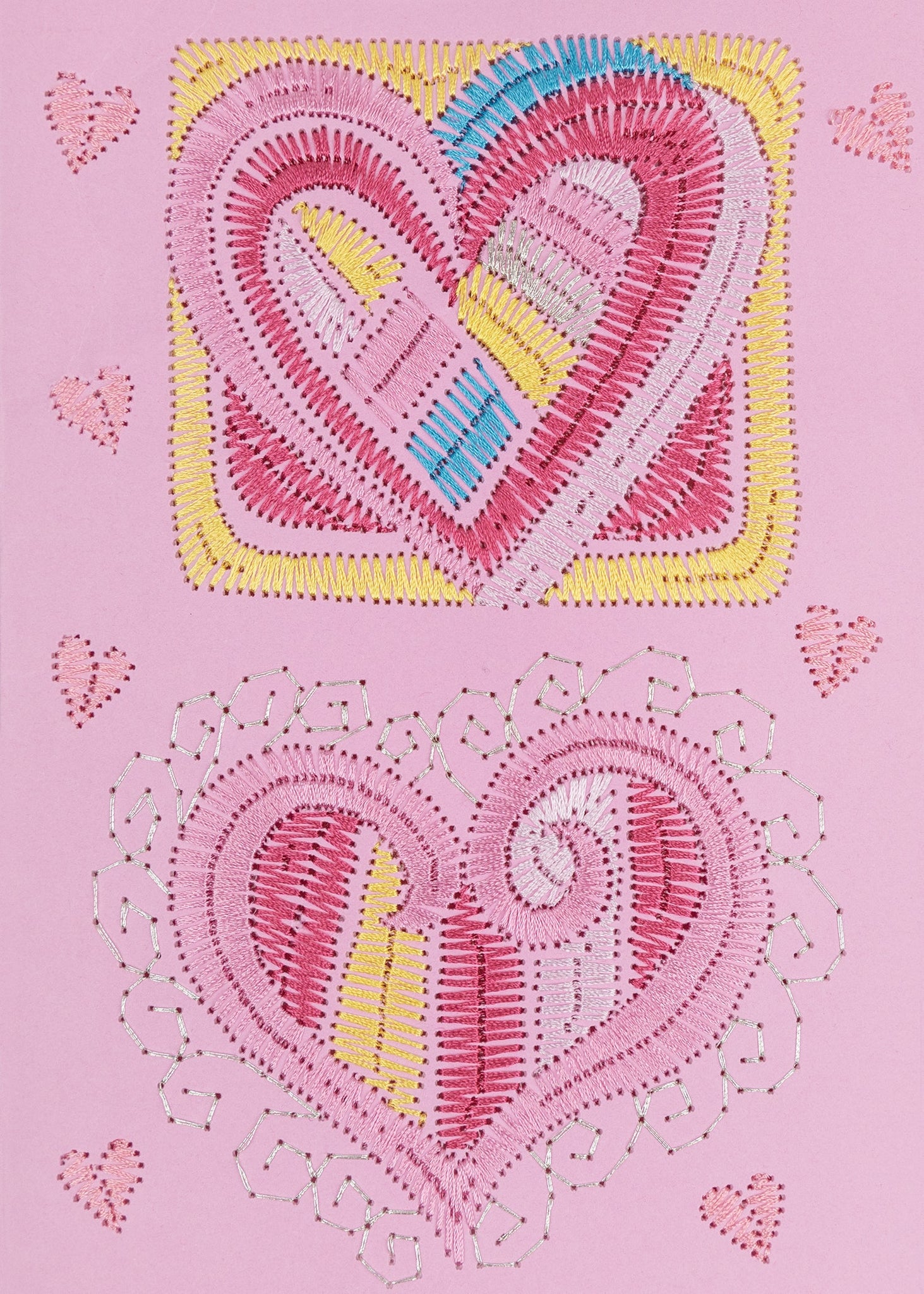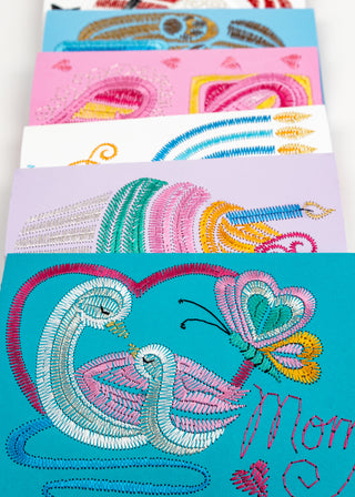 Digitized specifically for stitching onto paper, all you’ll need is some blank card stock, fun threads, and a few spare minutes to make one of these adorable, heart-felt card designs.