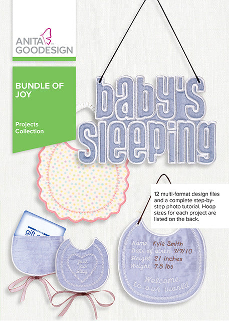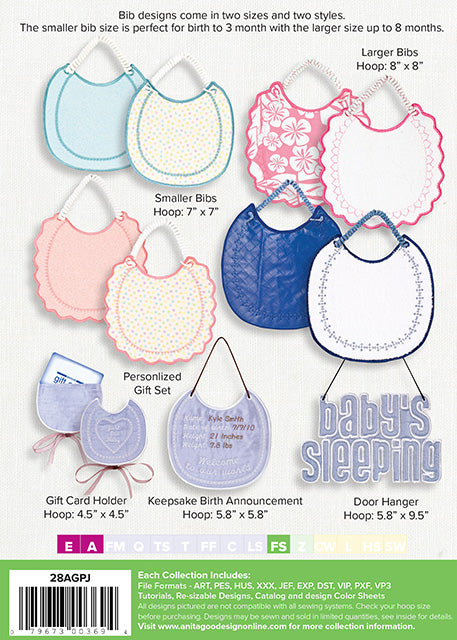 This collection consists of 12 multi-format designs for that special little bundle of joy. There is a great gift set project that can be personalize with the baby’s name, date of birth, weight and height along with a gift card holder perfect for new baby’s arrival. The smaller bibs were created using a soft flannel material and the larger bibs were made using a terry cloth fabric on one side and a vinyl material on the opposite side for easy clean up. The hoop sizes for each project are listed along with a step-by-step tutorial.