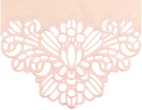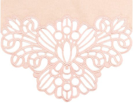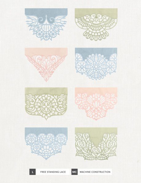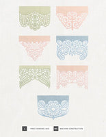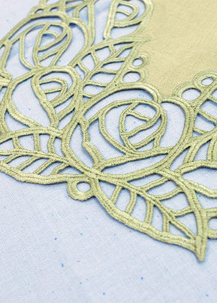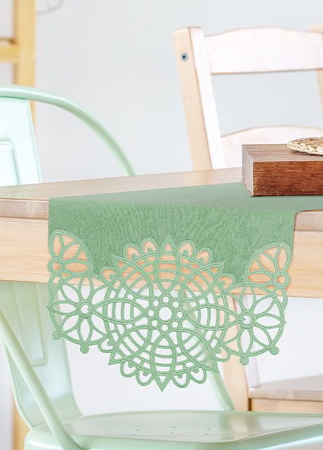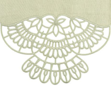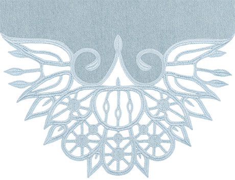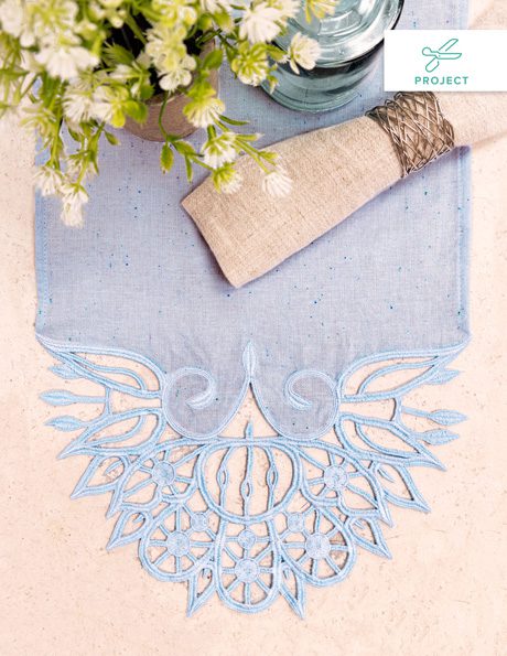 The lace is created and attached in the hoop by stitching on water soluble stabilizer, which is rinsed away at the end for the freestanding effect. The lace is specially digitized to not unravel, for an effortless doily effect that is delicate but sturdy. Once you stitch your lace ends, simply use your machine to hem the long edges of the fabric, and your runner is complete!