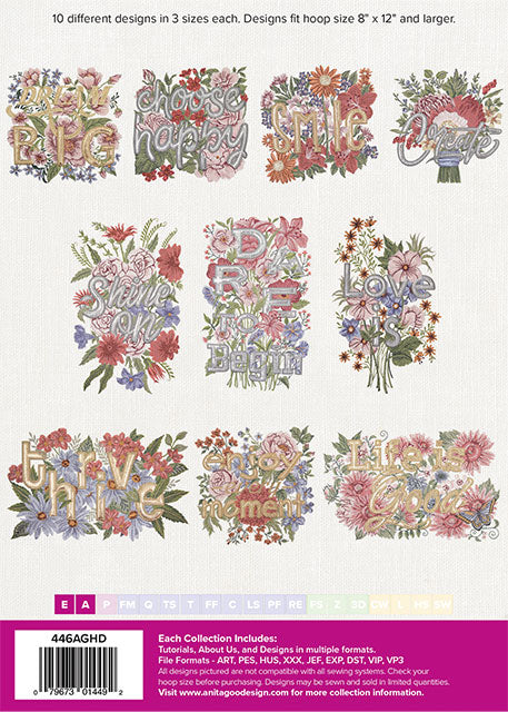 These 10 fabulous floral creations feature realistic stitching within their blooms, surrounding big and bold text. Various font styles, flowers, and phrases are turned into motivational and uplifting embroidery accents, perfect to use around the home, on decorative items like pillows, and even added to a teen’s favorite jacket or tote. However you stitch them, we know these large sizes will have you turning heads to see those stitches!
