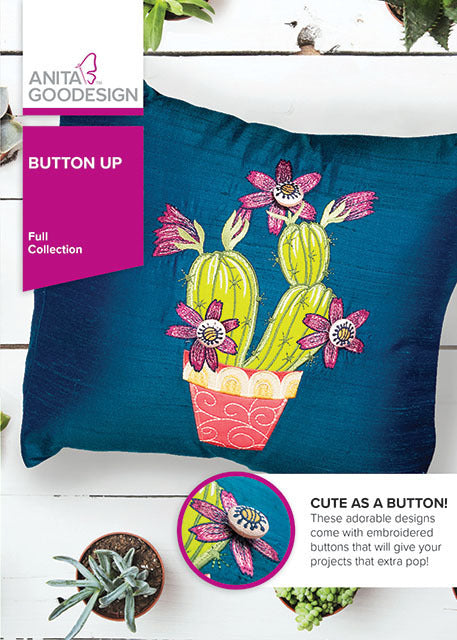 Have you always wanted to add decorative buttons to a jacket, hat or pillow, but couldn’t find the one you wanted? Anita has your solution with the Button Up collection. There are 22 different button designs in several different themes. Flowers, berries, waves, and so many more great looking button designs will make you want to put them on everything!
