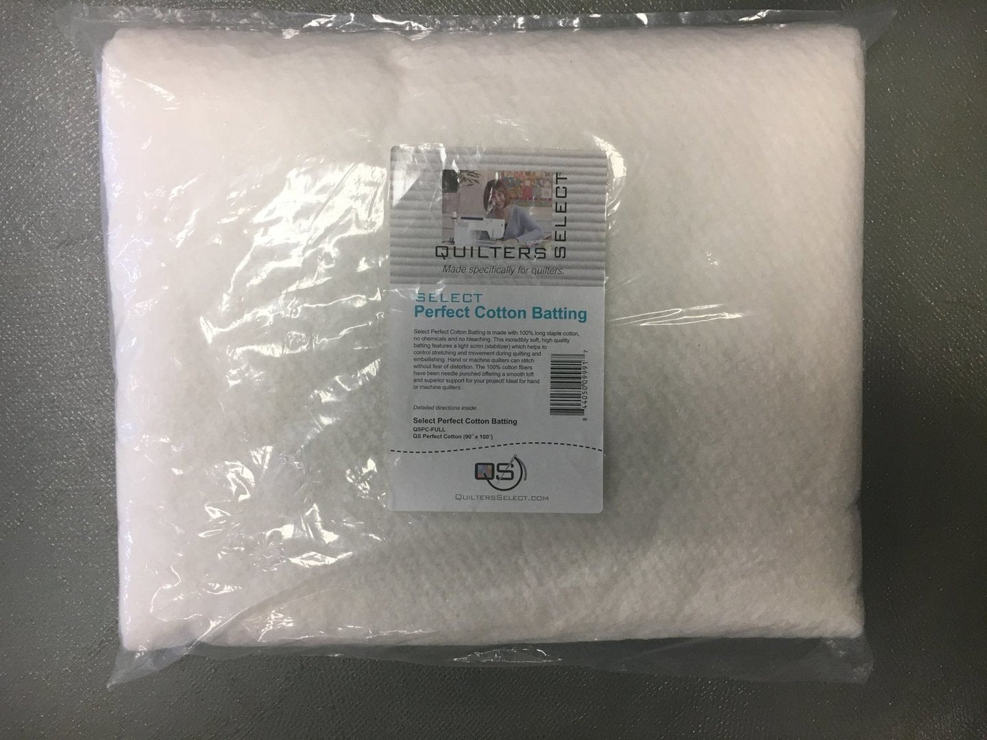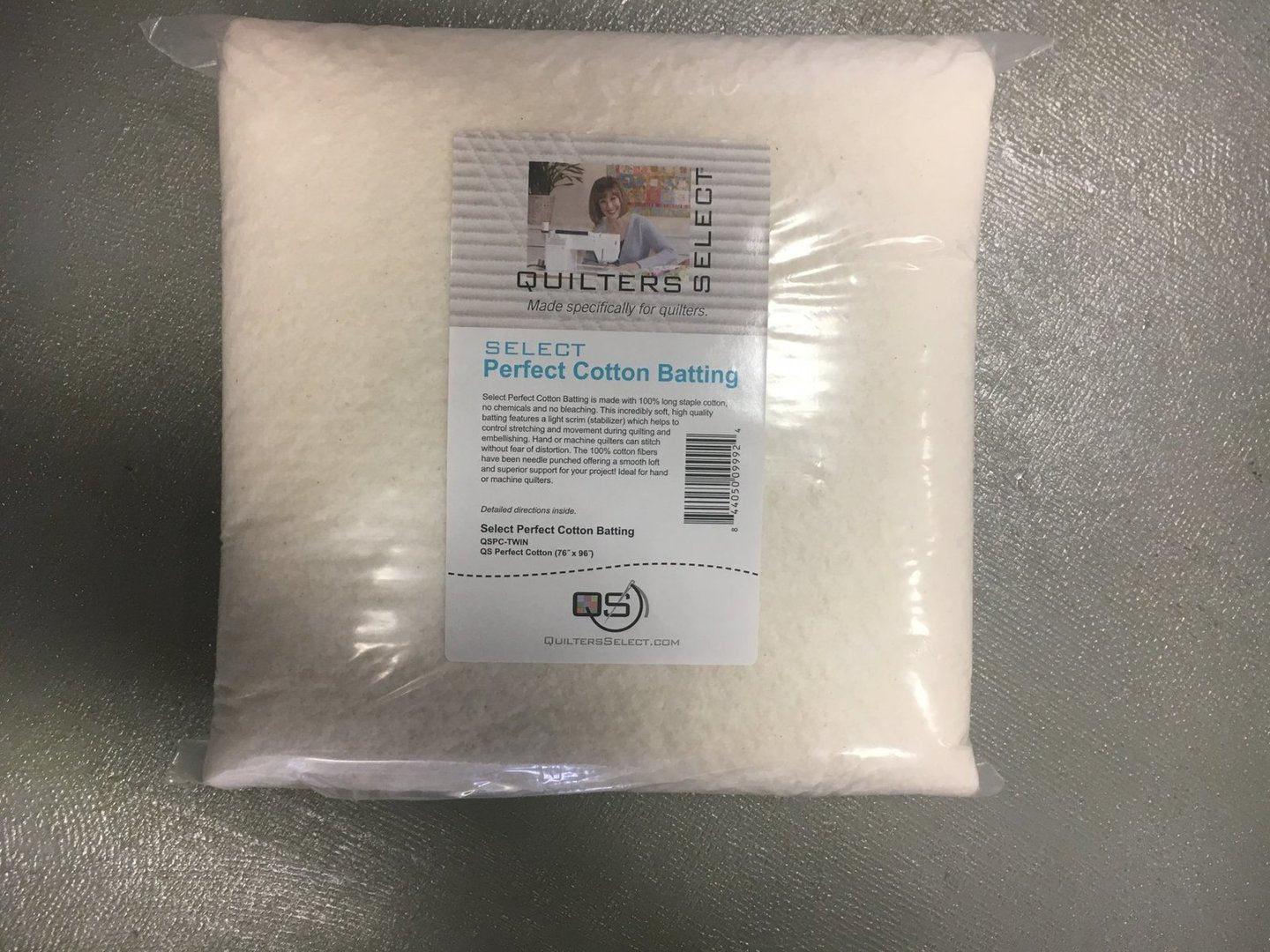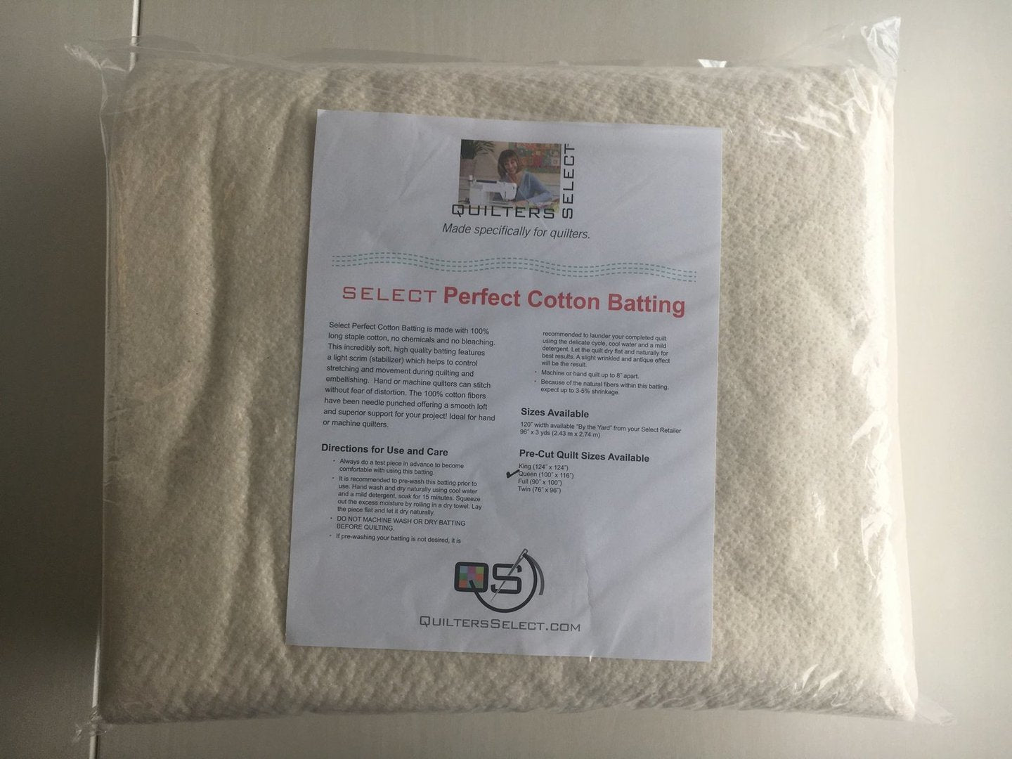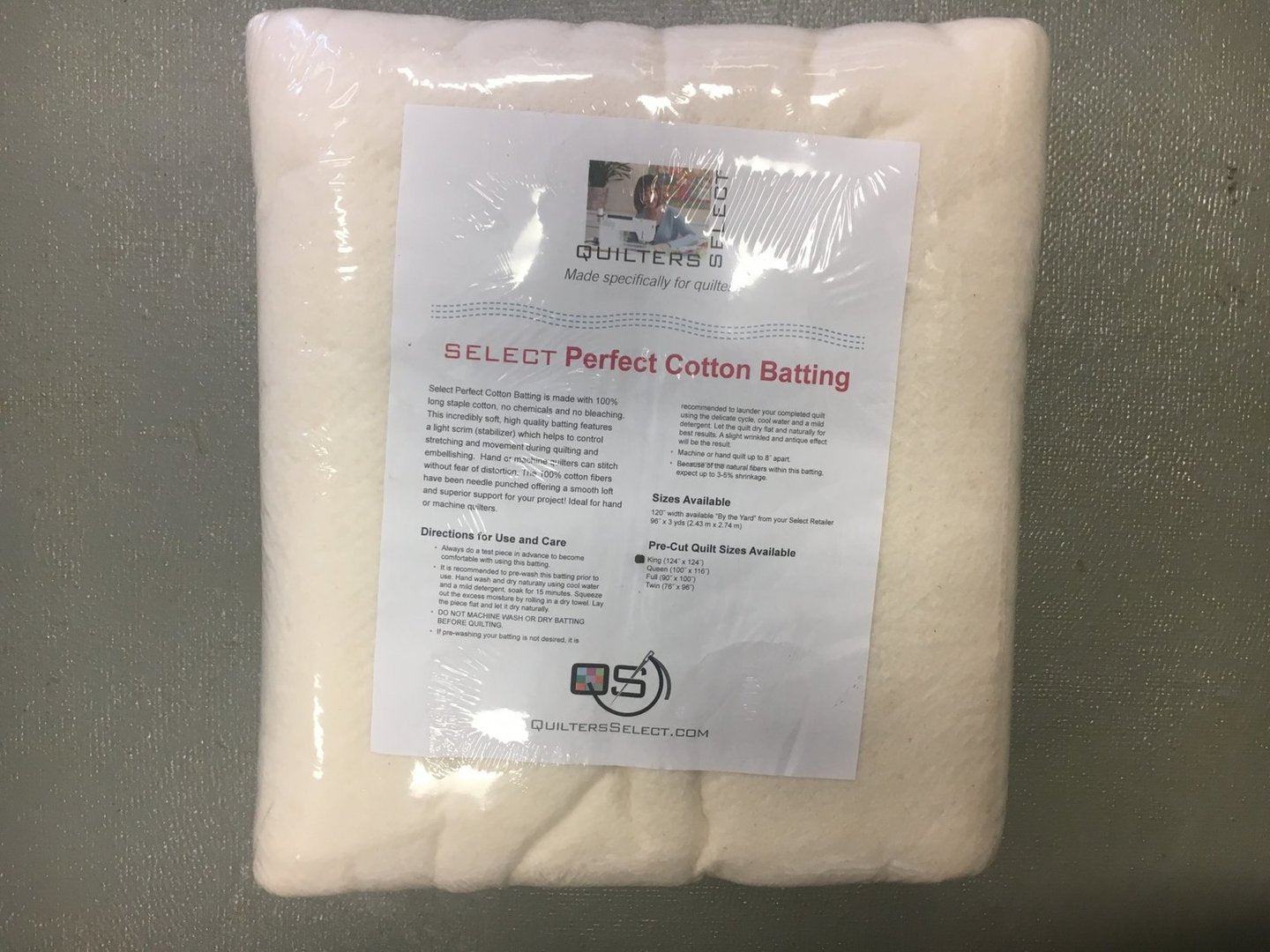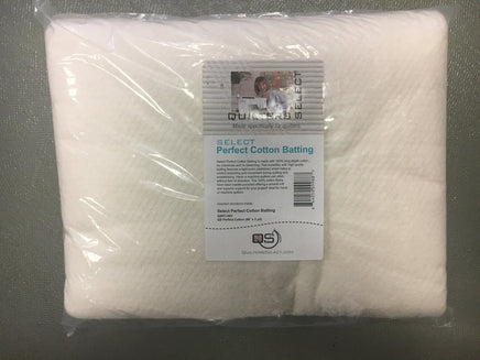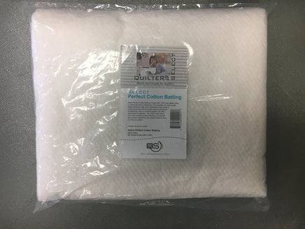 Select Perfect Cotton Batting is made with 100% long staple cotton, no chemicals and no bleaching. This incredibly soft, high quality batting features a light scrim (stabilizer) which helps to control stretching and movement during quilting and embellishing. Hand or machine quilters can stitch without fear of distortion. The 100% cotton fibers have been needle punched offering a smooth loft and superior support for your project! Ideal for hand or machine quilters.