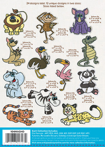 Each of the 12 different animals comes in 2 sizes, the first for the 5”x7” hoop and the second for the 6”x10”. All of the designs use applique to keep the stitch counts from getting too high, for our animals we used felt as our applique. For our project we embroidered the animals on a hooded sweatshirt and then further embellished the sweatshirt with faux animal fur to coordinate with the designs. We’re sure you will love embroidering this collection.