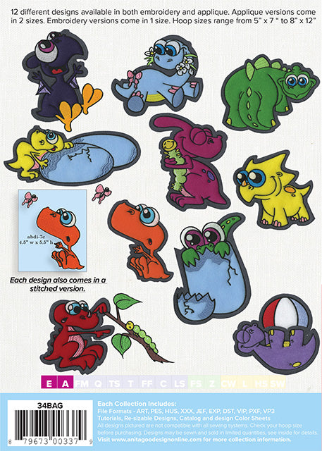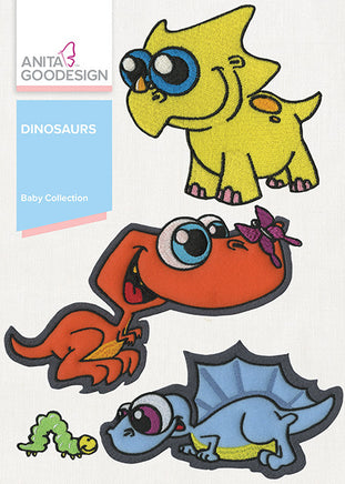 This is another collection designed by our artist Rachel, when we suggested baby dinosaurs she immediately understood our direction and created 12 cute and cuddly dinosaurs. The end result once they were embroidered was stunning. We went in a slightly different direction with this collection; each dinosaur comes in three versions, a large and small applique and a stitched design. The project we created is a wall hanging that contains 4 of the dinosaurs. There is an additional tutorial included on the CD-Rom called “Baby Tutorial” This tutorial demonstrates how to embroider applique designs, it also includes pattern and ideas for quilts, diaper bags, bumper pads and other baby projects. We chose a flannel for the background and an assortment of colors of felt for the appliques of the dinosaurs. We wanted to give the completed project a bright look and the brightly colored felt fabric did the job.
