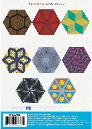 For this quilting collection I wanted to do something that is completely different from anything Anita Goodesign has ever released. Instead of creating a quilt with squares we will be using triangles! The end result is beautiful triangle designs that when stitched together looks like a kaleidoscope. The projects are made by stitching 3 small triangles into one large triangle. You can then stitch multiple large triangles together to create quilts place mats, table runners or anything you desire. We have also included smaller triangles that you can use to create square and rectangular shapes instead of hexagrams. Each of the designs come in two sizes. 3”x10” and 2”x7”. The smaller size makes great place mats while the larger size will make a beautiful table centerpiece. The instructions will teach you everything you need to know to create a kaleidoscope quilt.