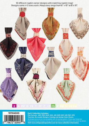 We have created napkin corners in the past, but until now we have never created matching napkin rings. Each of the elegant napkin corners has a matching ring. The napkin rings are created in a unique way using our freestanding embroidery technique, with embroidered tabs for fastening them built right into the design. We have also included a tutorial on how it create your own napkins using new and innovative techniques, as well as a guide to adding a monogram to your napkins. These projects are a great way to decorate your table! 12 different napkin corner designs with matching napkin rings! Designs come in 2 sizes each. Hoop sizes range from 6″ x 10″ to 8″ x 12″.