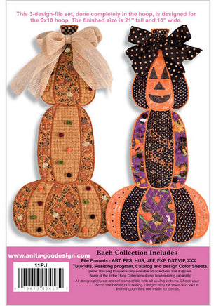 This 3-design-file set, done completely in the hoop, is here just in time for those celebrations! It is designed for the 6x10 hoop and, depending on your fabric choices and optional use of the faces and wording, you can be ready to greet Thanksgiving guests or neighborhood ghouls. Each of the pumpkins is done separately in the hoop and then joined in the hoop to the previous pumpkin. Each features a dense fleece batting and a back fabric for a finished look, and each section of each pumpkin is embellished with decorative stitching. Once it’s finished you can have lots of fun with additional embellishing, depending on your preferences. Just one tip--check your guests as they leave to make sure your door hanging hasn’t left with them! The finished size is 21” tall and 10” wide.
