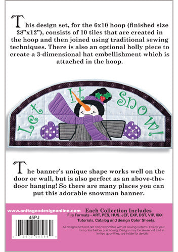 This design set, for the 6x10 hoop (finished size 28”x12”), consists of 10 tiles that are created in the hoop and then joined using traditional sewing techniques. There is also an optional holly piece to create a 3-dimensional hat embellishment which is attached in the hoop. Each tile is sewn on muslin instead of stabilizer and features a dense fleece batting for body, plus lots of fun applique and detail. The holly is sewn on dissolvable stabilizer and also features fleece batting as well as a finished back. After the tiles are joined, a stiffened back fabric is sewn on, the edges are bound, a thread hanger is added with additional embellishing as desired, and your new friend is ready to handle whatever Mother Nature brings his way!