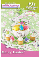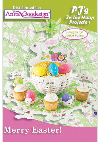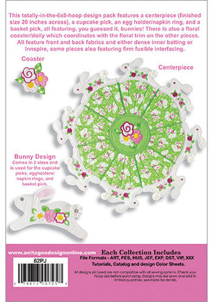This totally-in-the-6x8-hoop design pack features a centerpiece (finished size 20 inches across), a cupcake pick, an egg holder/napkin ring, and a basket pick, all featuring, you guessed it, bunnies! There is also a floral coaster/doily which coordinates with the floral trim on the other pieces. All feature front and back fabrics and either dense inner batting or Innspire, some pieces also featuring firm fusible interfacing. Several of the pieces offer perfect opportunities for accent embellishments as well. The projects are sure to provide a festive Easter look on your table and bring a smile to that bunny in case he drops by--oh, wait, do bunnies smile?