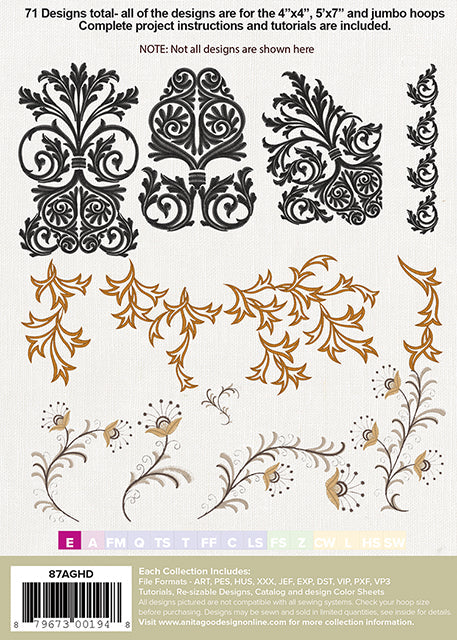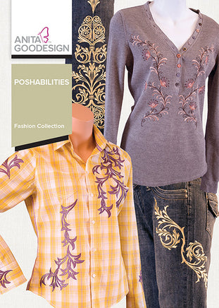The POSHabilities collection consists of three different design sets that are perfect for all types of clothing. We created this collection with a few things in mind. The first aspect was to create designs that link together to form larger arrangements for jeans and shirts and the second important part was to make the designs look great by themselves and not have to be linked together. We achieve this with great results! You will see examples of six different garments using these designs in the following pages. We are also presenting you with 9 different reference pages that show you which designs link together and for what purpose.