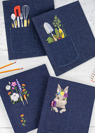 Let your notebook covers be bold and beautiful to show off your personality! With 10 notebook covers to choose from, you can organize and decorate all the binders and notebooks you need. Follow our step by step instructions to find out how to make the perfectly sized cover for a 1 1/2” three ring binder! Use the kitchen themed cover on your recipe notebook to protect your book from kitchen disasters and look good doing it. Or make a cute cover for your kid’s school binders. There’s a cover for everybody in this collection, whether you’re an artist, animal lover, or gardener extraordinaire! Each cover is fully embroidered, so all you need to worry about are your thread colours and the fabric you want to use for your cover.