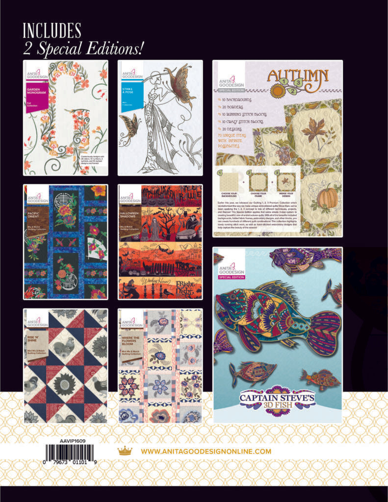 The September All Access is one of our biggest Issues Yet! There are six different collections in this issue, as well as two different Special Editions,all in one book. The Special Editions are both very different. The first one is Captain Steve’s 3D Fish. It will teach you how to create amazing 3D artwork on your embroidery machine. The second Special Edition features our amazing Quilting 1,2,3 technique with new autumn designs. You can use these amazing backgrounds and borders with the included autumn designs or with your own autumn designs. The regular releases include everything from fashion to Halloween designs so, no matter what type of project is on your agenda this month, you will find the right designs in this issue. We are also including six preview designs and a glimpse at new artwork that we are working on. You will love the September Issue! Next, you’ll find a little more information on this month’s collections.
